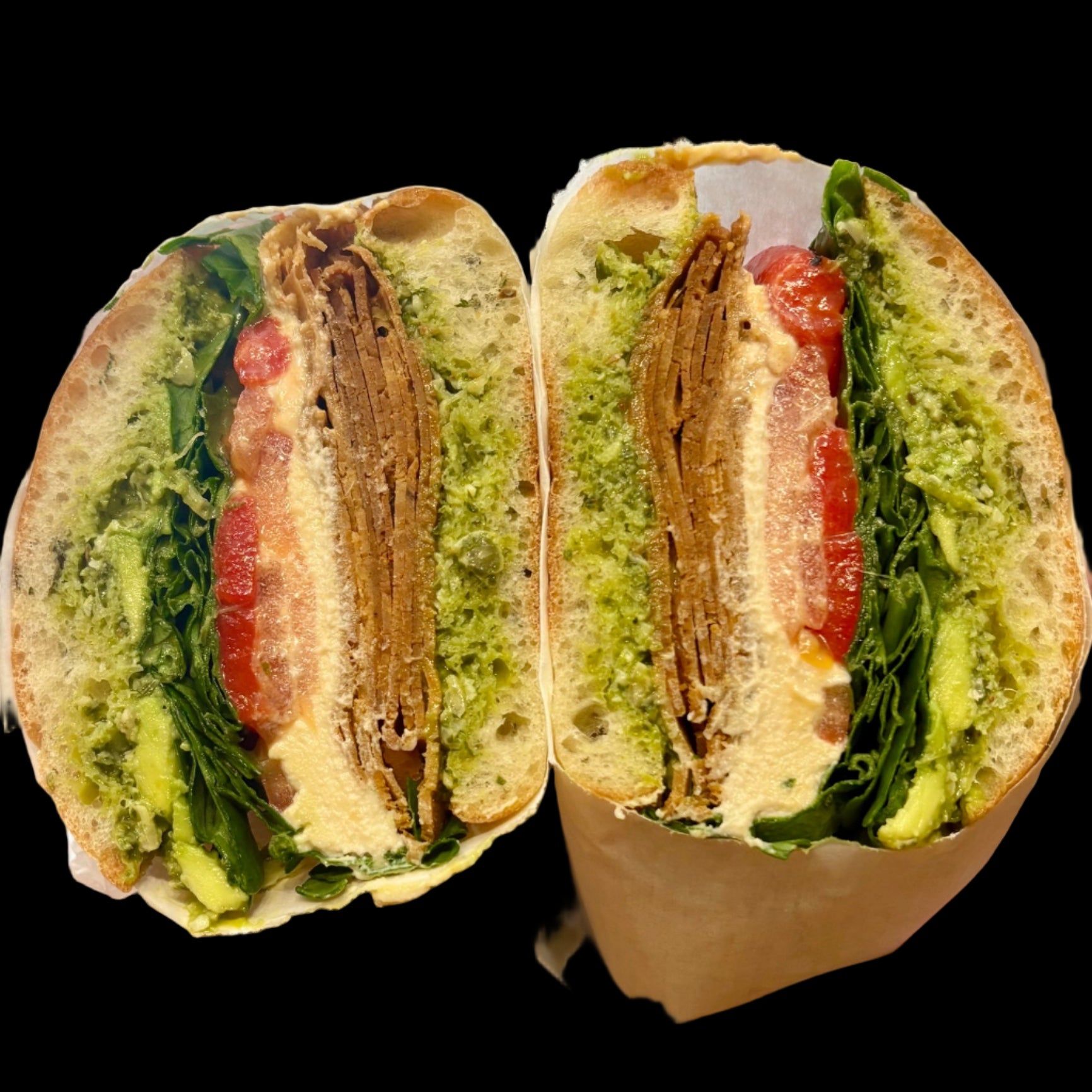 Vegan deli magic - housemade seitan, scratch spreads, and a little love between every slice.